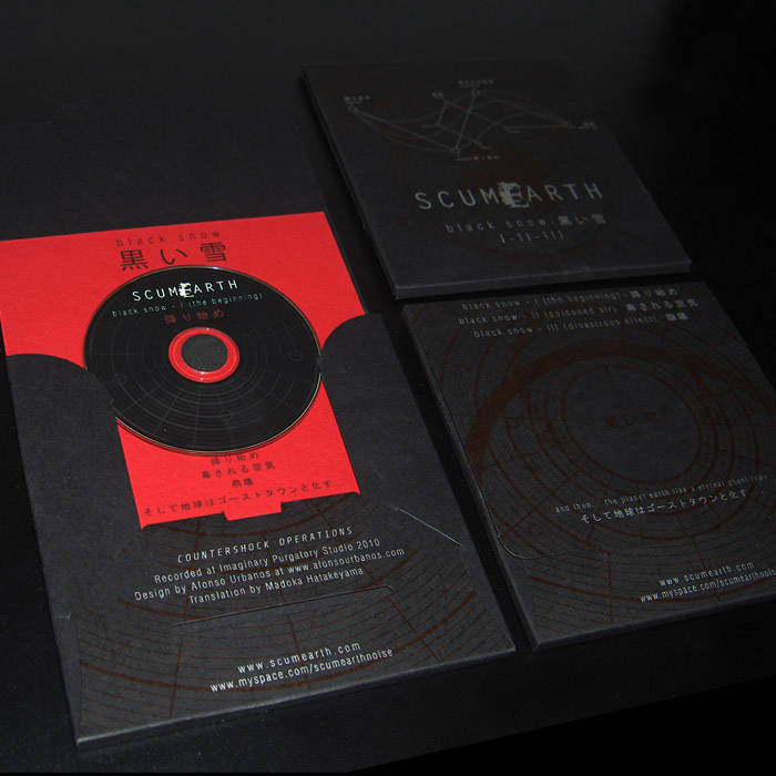 "Black Snow" es un doble miniCD con tres pistas en total que conforman una tríada, son las distintas fases que nos hacen transitar por el negro invierno que nos propone Scumearth. Formalmente los temas se componen de los mismos elementos: unos espectaculares graves que revientan los waffles y que van oscilando como las sinuosas curvas de un sendero iniciático a través del que caminamos ciegos. El contrapunto a la densidad son ruidos, como saltos en un CD, como errores en la pista de grabación, pero que están puestos a propósito para soliviantar al oyente. En algunas ocasiones escuchamos voces, ruidos, que se añaden a la provocación de una sensación visceral. No hay melodía, tan solo sonido, puro y duro, que ha sido configurado para alterar nuestra percepción. Y es ahí donde reside la grandeza de este trabajo.